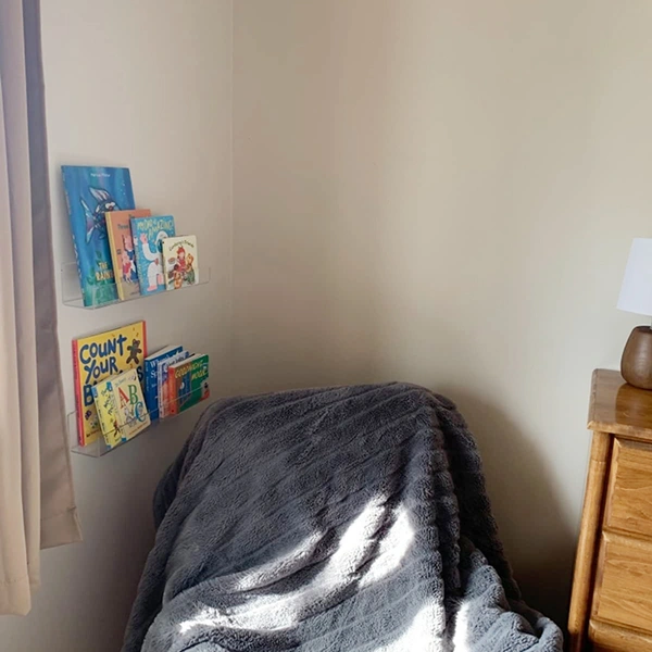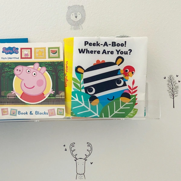 هذه الأرفف المصنوعة من الأكريليك تتناسب تمامًا مع أي نوع من الديكور ، وفي حالتي ، وضعتها أعلى ورق الحائط الخاص بي ، فهي تبدو جميلة جدًا! لا تشغل مساحة بصرية ، لذلك يذهب البصر مباشرة إلى ما تضعه عليها ، وهذا ممتاز لكتب الأطفال ، ويمكن وضعها في مكان منخفض جدًا حتى يتمكنوا من المضي قدمًا واختيار بعض الكتب الرائعة عندما يشعرون بذلك!