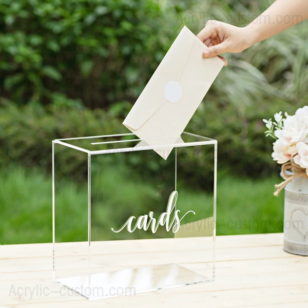 صندوق بطاقة الاكريليك ليوم مثالي! صندوق البطاقات البسيط والحديث هذا سوف يجذب انتباه ضيفك ويسهل عليهم إلقاء بطاقاتهم فيه. بعد الزفاف ، استخدم هذا الصندوق لتخزين النقود ، وفلين النبيذ ، وما إلى ذلك.