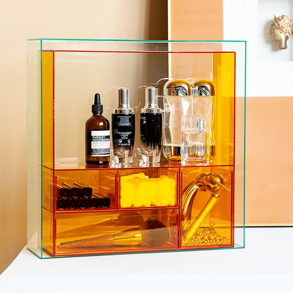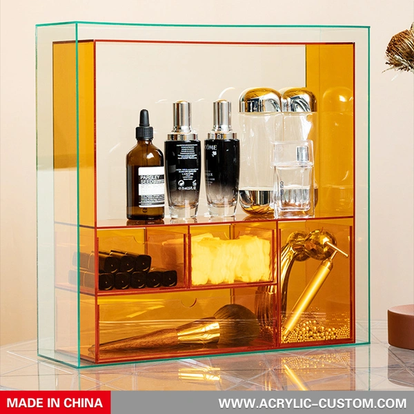 Finden Sie Schönheit in organisierter Form mit dem Aufbewahrungskoffer für Kosmetik, Make-up und Schmuck von Acrylic-custom.com. Es verfügt über eine elegante, durchsichtige Konstruktion, in der Sie Ihr Make-up und Ihren Schmuck mühelos aufbewahren können. Die Schubladen im Unterschrank sind ideal für übergroße Kosmetika, Toilettenartikel und Pflegeutensilien, während die oberen Schubladen kleinere Gegenstände aufnehmen. Es verfügt außerdem über eine herausnehmbare schwarze Netzpolsterung, um Gegenstände geschützt und an Ort und Stelle zu halten. Schubladen eignen sich perfekt zum Aufbewahren von Lippenstiften, Grundierungen, Bronzern, Rouge, Lidschatten, Grundierungen, Pudern, Schmuck, Accessoires, Andenken und vielem mehr!